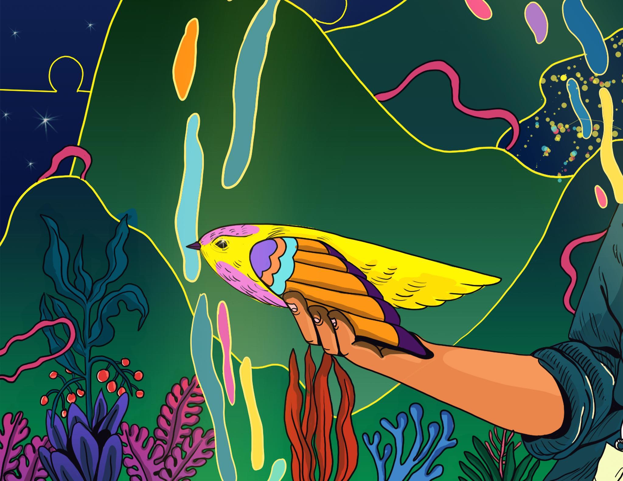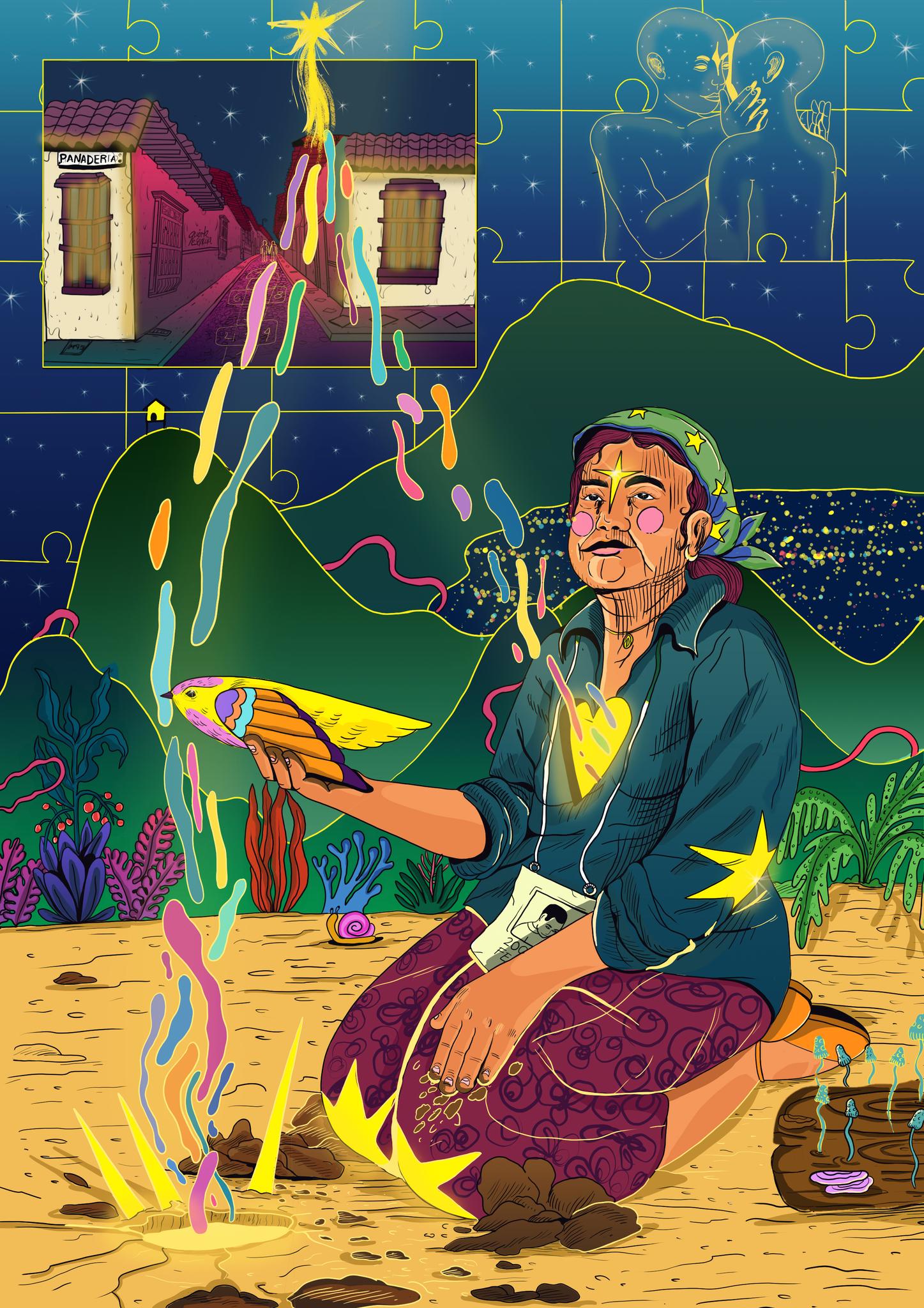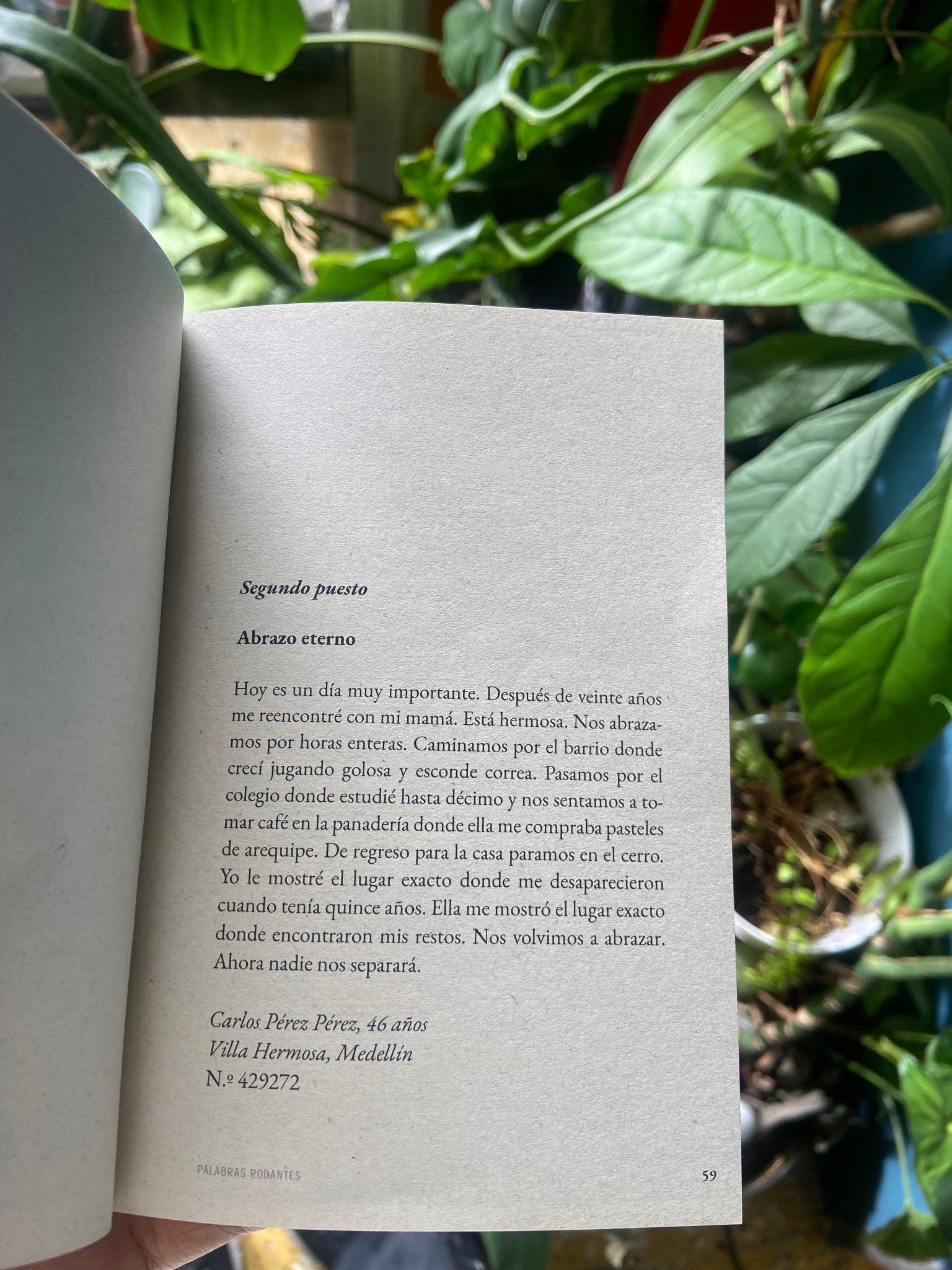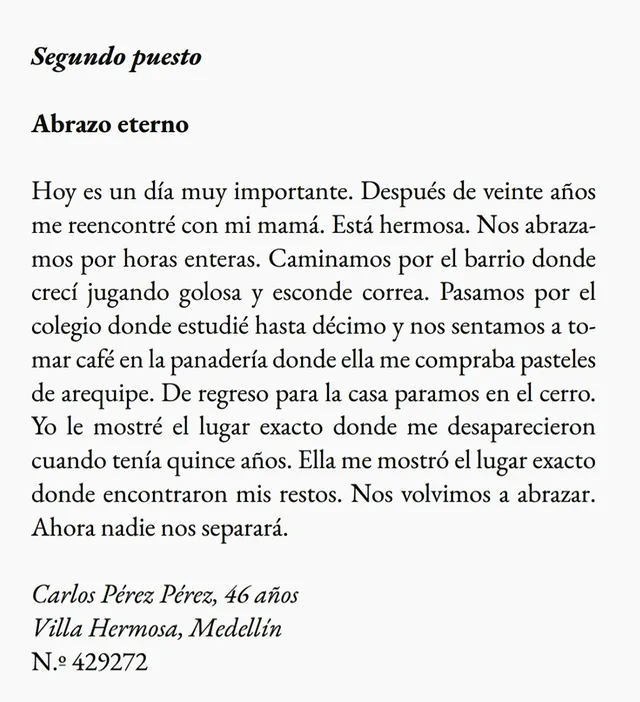 Esta ilustración fue realizada para acompañar el cuento ganador del segundo lugar en la categoria de adultos "Abrazo eterno" de Carlos Perez. No fue fácil dibujar esta historia, porque mientras me ponía a pensar en qué imagen podría acompañar este cuento, aparecieron recuerdos no tan gratos de la infancia, de los años de la operación Orión en Medellin, en los que yo también como parte de esta ciudad, tuve que vivir situaciones muy dolorosas; de esa violencia que no desaparece y que muchas veces se queda guardada en la cuerpa aunque el tiempo pase y la vida siga. La desaparición forzada y estás violencias no son ajenas a la historia personal de muchos colombianos, son temas que despiertan en mi memoria una tristeza antigua y una empatía muy pero muy honda.